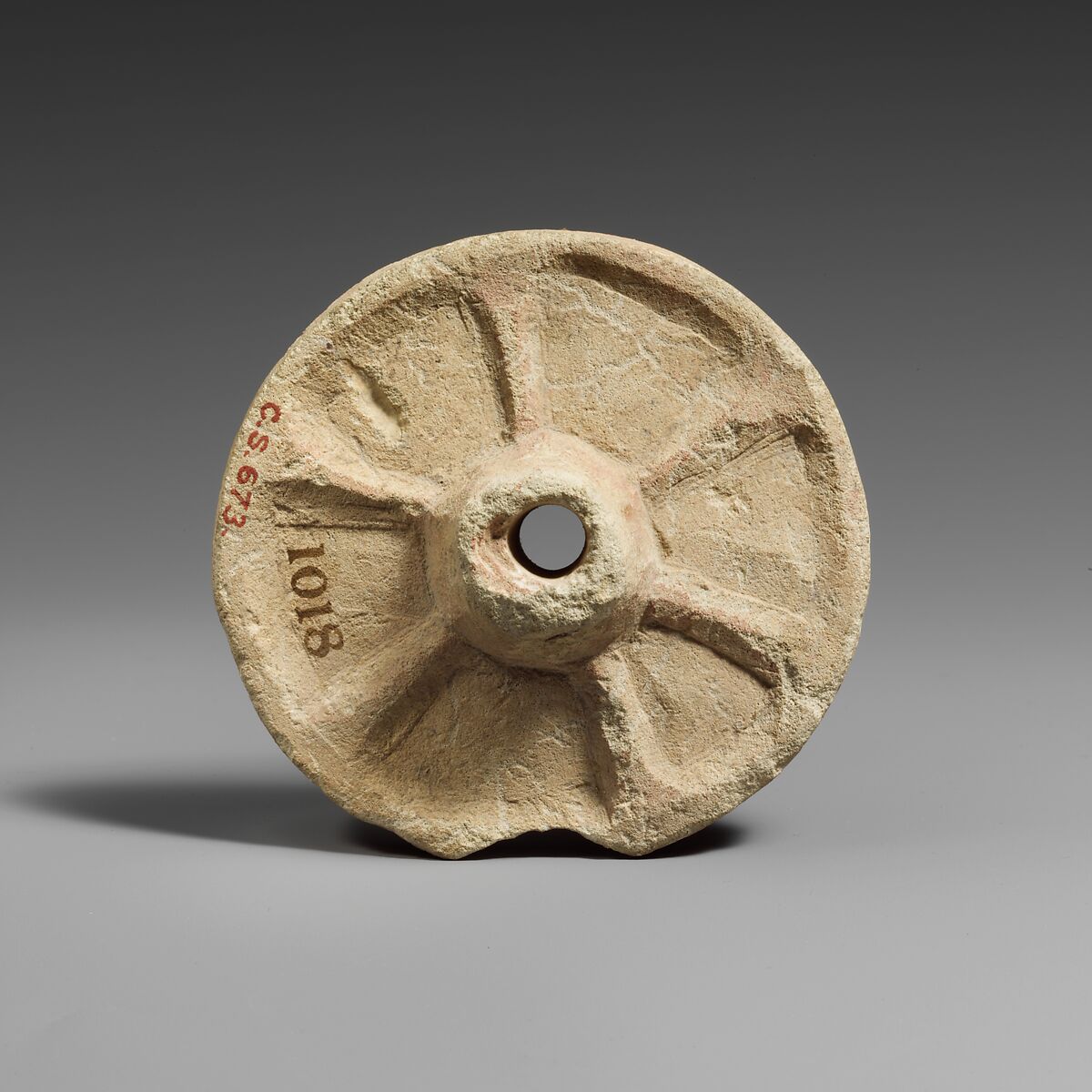 The wheel of the chariot is quite large. It is solid, with six spokes in low relief. There are traces of red paint.