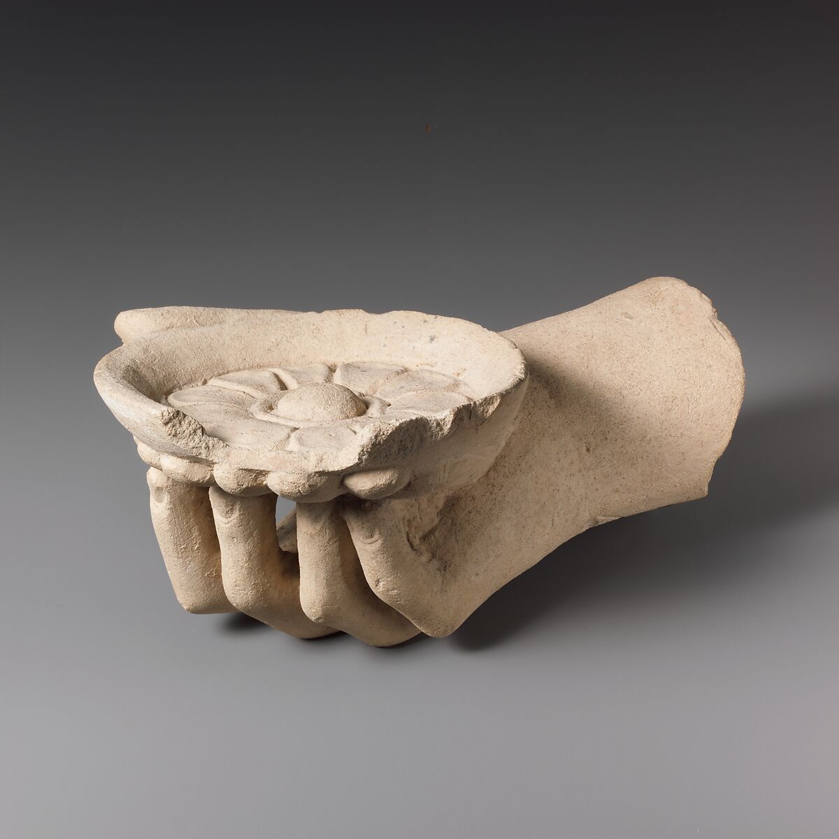- Title:Limestone hand holding a phiale (libation bowl)
