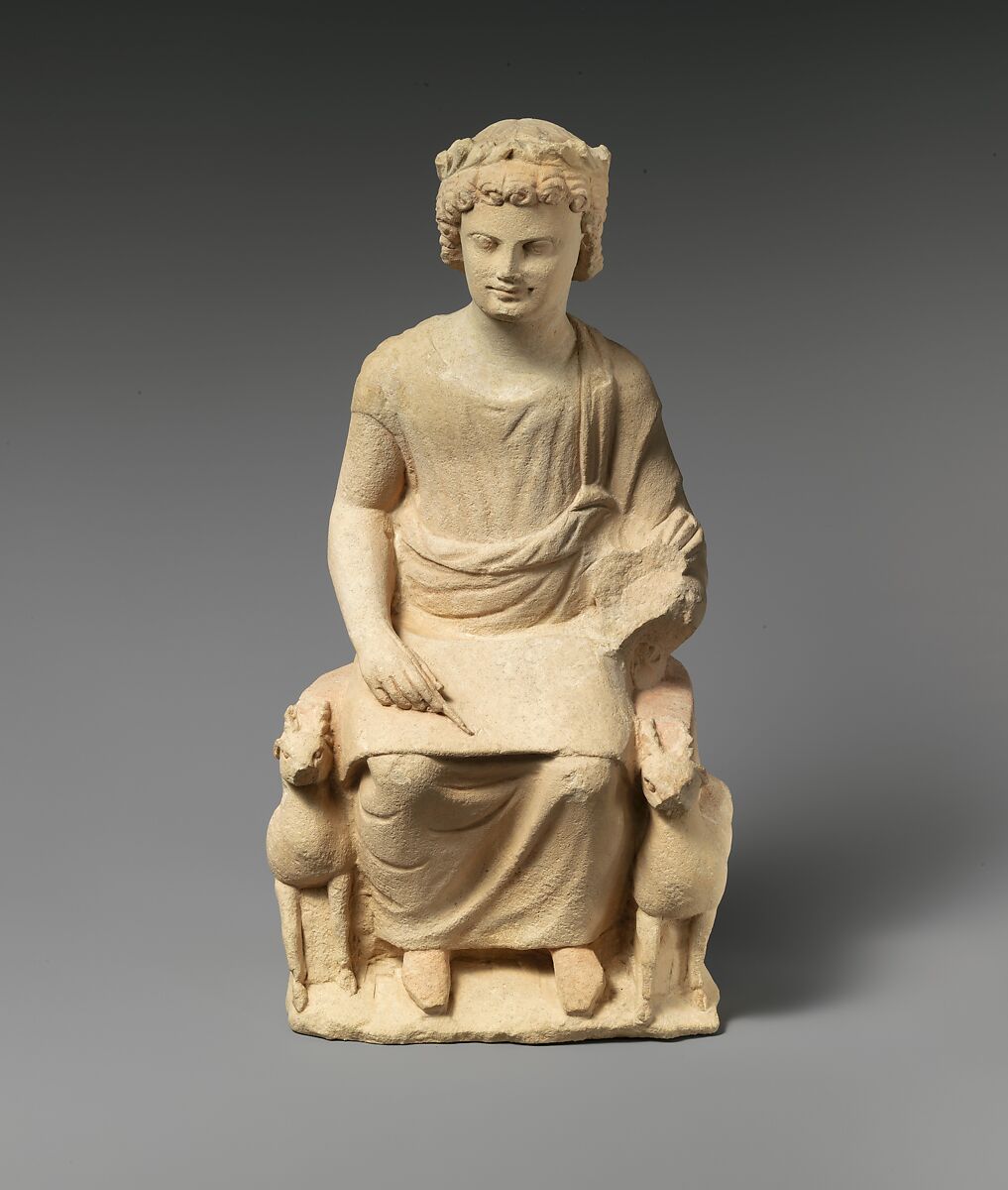 This seated figure holding a roll of manuscript across his knees and a stylus in his right hand could represent a priest of high rank who transcribed oracles or other declarations of the god he served. The remains of a bird perched on his left hand and the elaborate throne with animals at the side suggest, however, that this statuette represents a deity—probably Apollo, the god of poetry and art, famous for his oracles. The bird may well have been a raven, the bird that often accompanies Apollo.