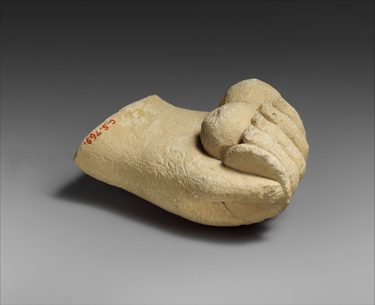 - Title: Limestone hand holding a disk and pieces of fruit