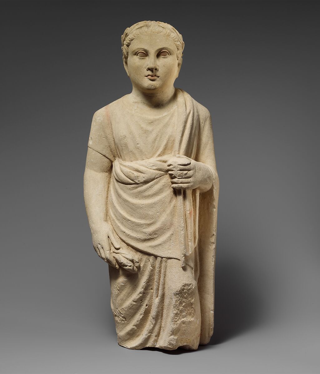 - Title: Limestone statuette of a boy holding a pyxis and a branch of leaves