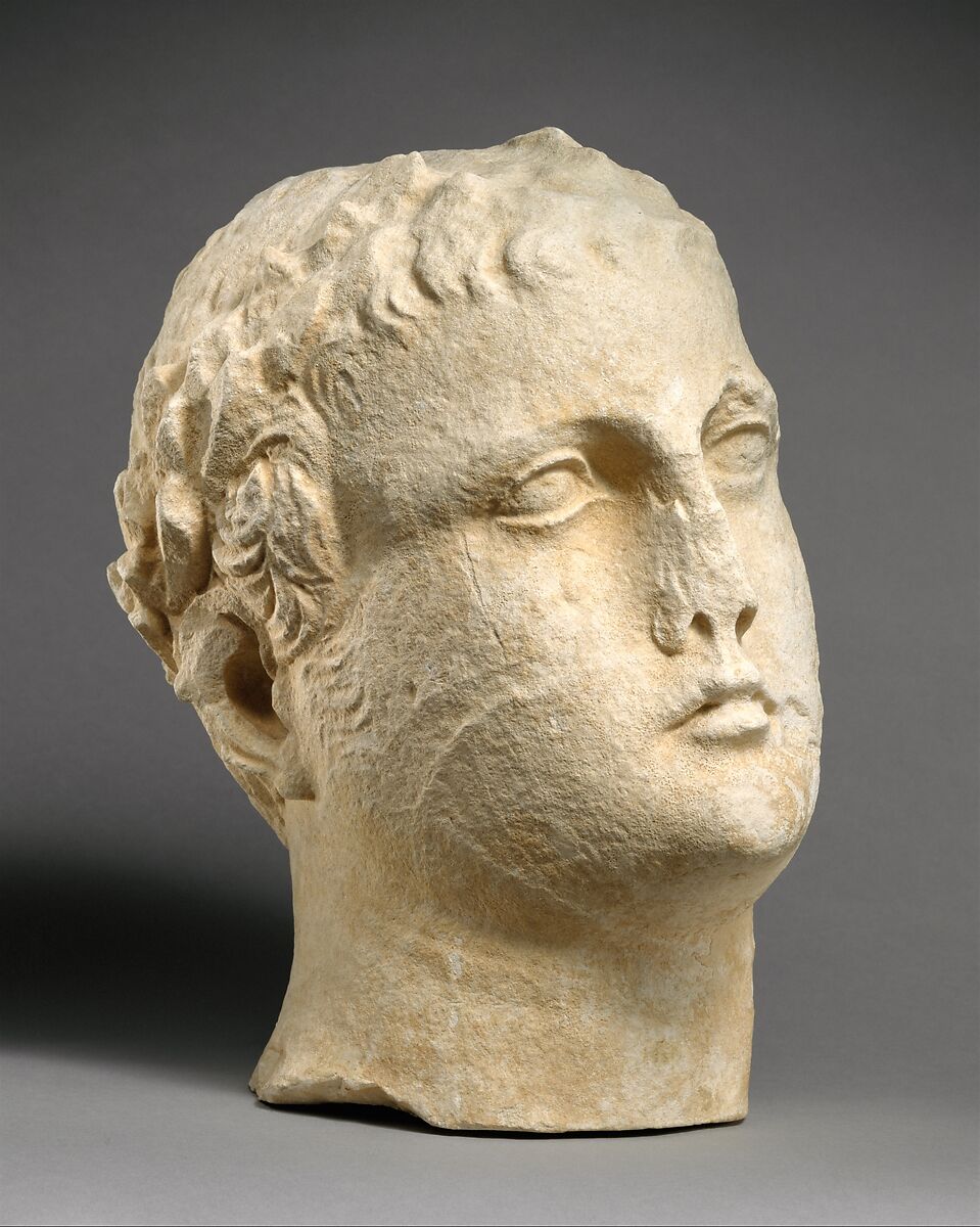 - Title: Limestone head of beardless male votary with wreath of leaves