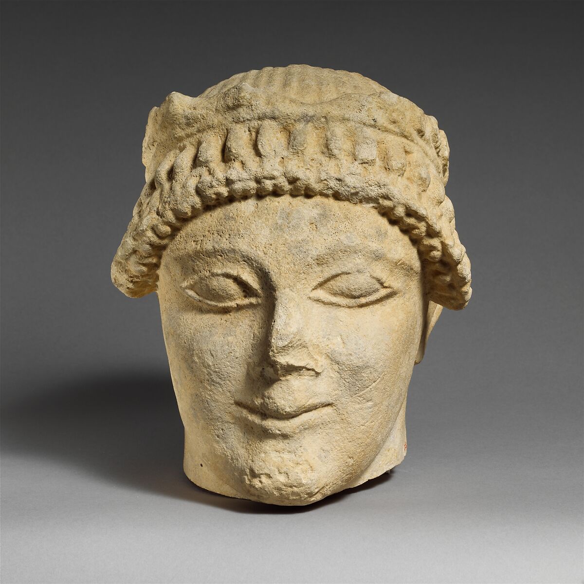 - Title: Limestone head of a beardless male votary with a wreath of leaves