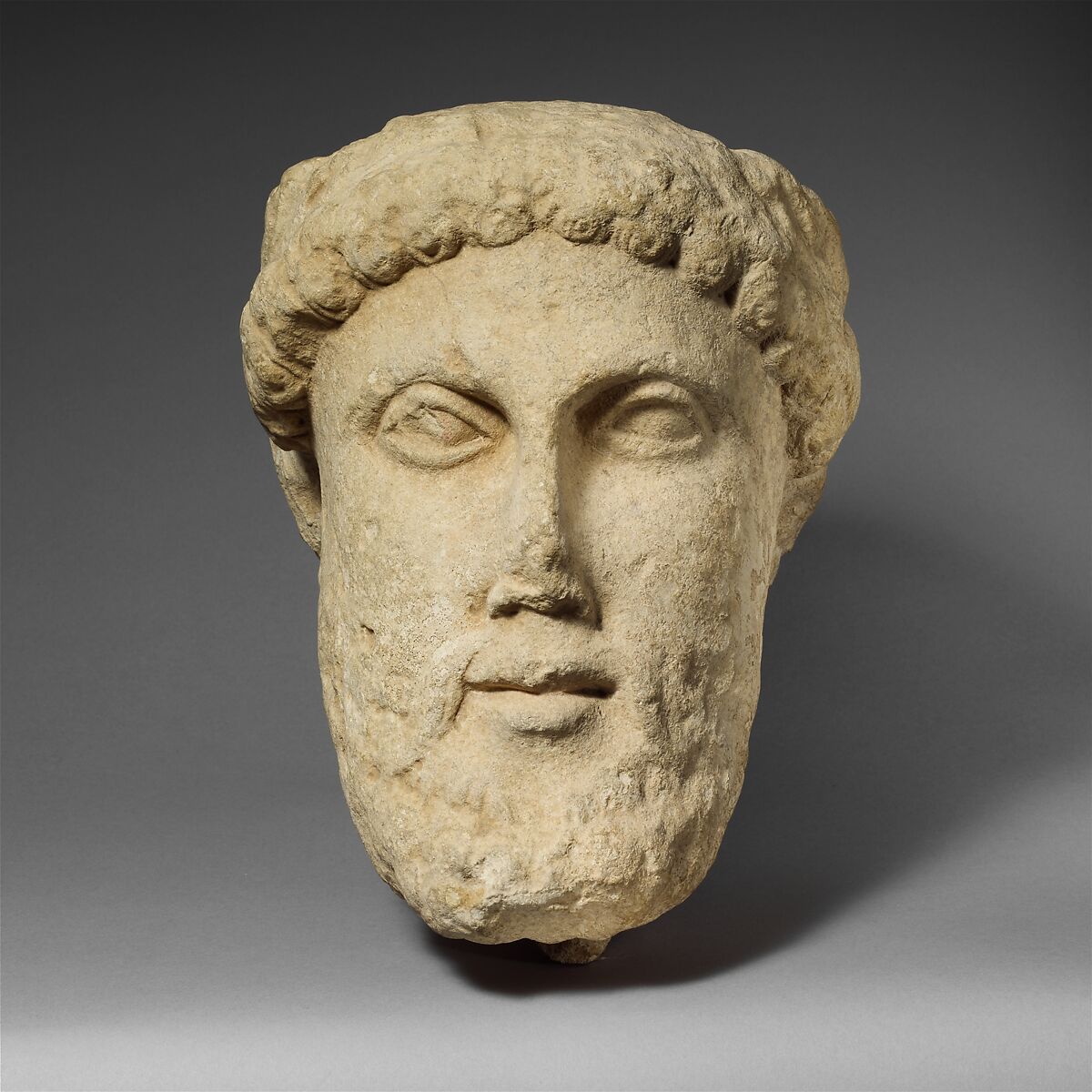 - Title:Limestone head of a bearded male with a wreath of leaves