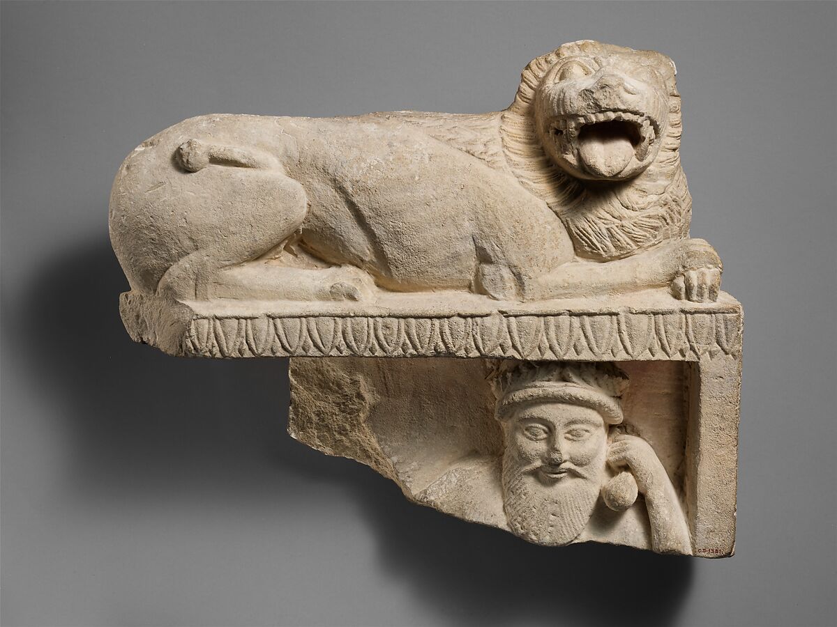 - Title: Limestone finial of a funerary stele with a recumbent lion and a banquet scene