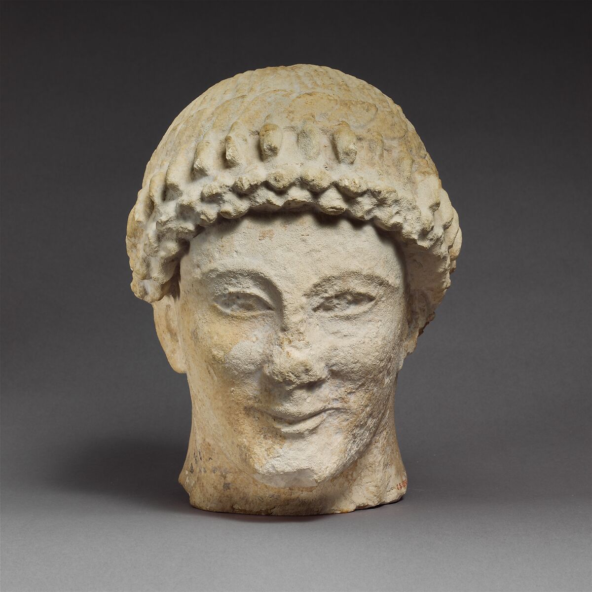 - Title: Limestone head of a beardless male with a wreath of flower buds