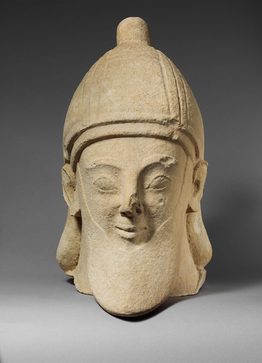 - Title: Limestone head of a bearded male wearing a conical helmet
