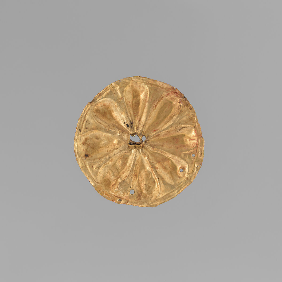 Made of hammered sheet metal, these gold roundels would have adorned a cloth or garment, probably a funerary shroud. Similar examples have been found in the Royal Shaft Graves at Mycenae and in Mycenaean tombs on the island of Rhodes.