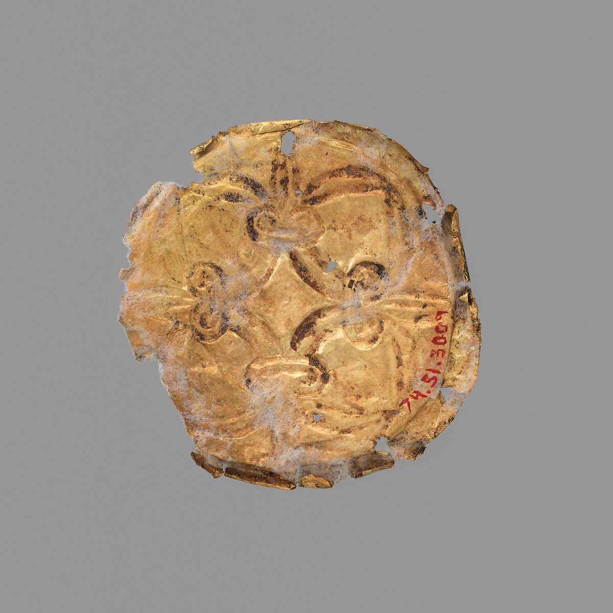 Made of hammered sheet metal, these gold roundels would have adorned a cloth or garment, probably a funerary shroud. Similar examples have been found in the Royal Shaft Graves at Mycenae and in Mycenaean tombs on the island of Rhodes.