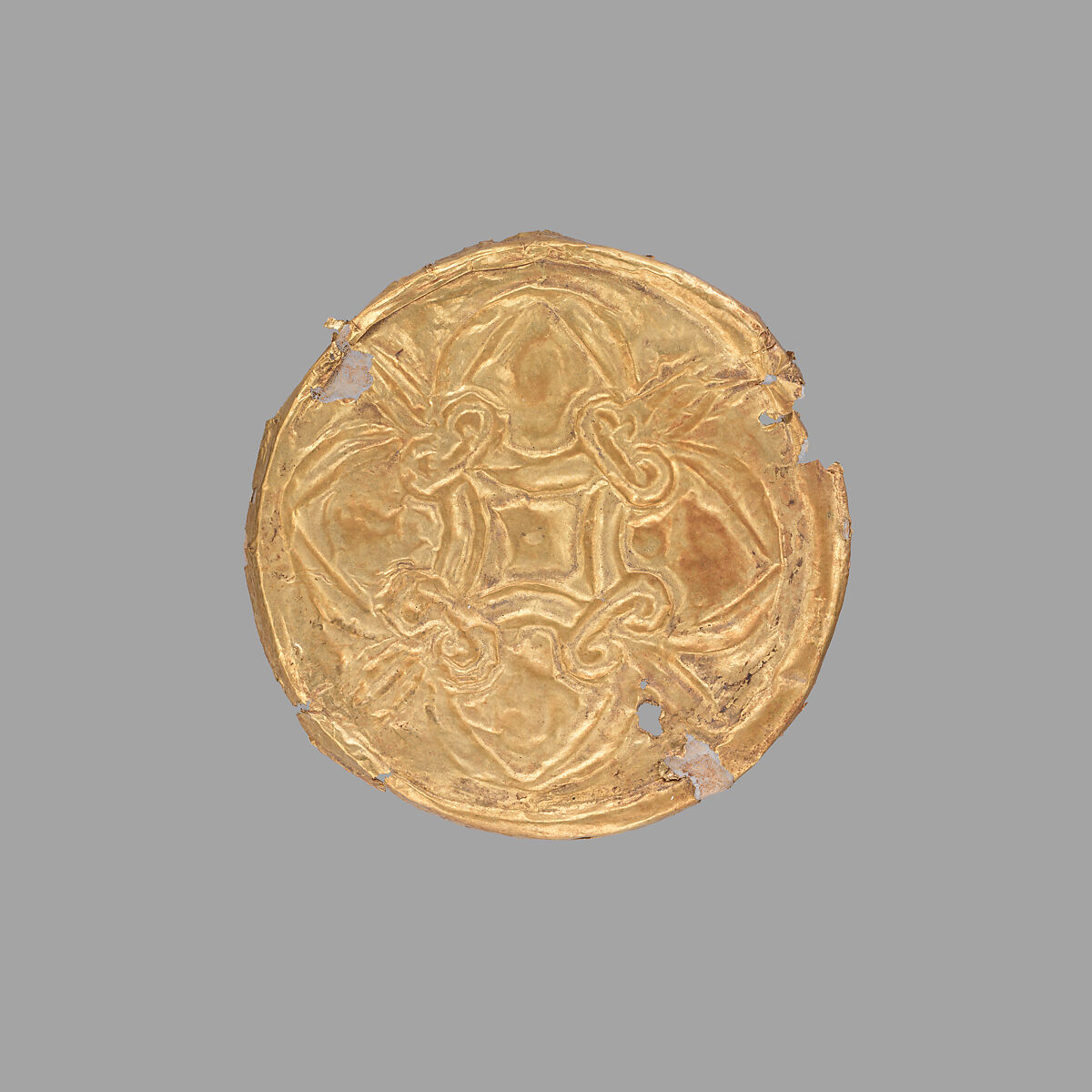 Made of hammered sheet metal, these gold roundels would have adorned a cloth or garment, probably a funerary shroud. Similar examples have been found in the Royal Shaft Graves at Mycenae and in Mycenaean tombs on the island of Rhodes.