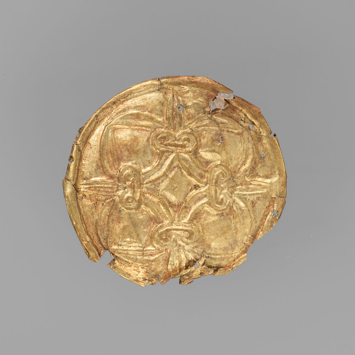 Made of hammered sheet metal, these gold roundels would have adorned a cloth or garment, probably a funerary shroud. Similar examples have been found in the Royal Shaft Graves at Mycenae and in Mycenaean tombs on the island of Rhodes.