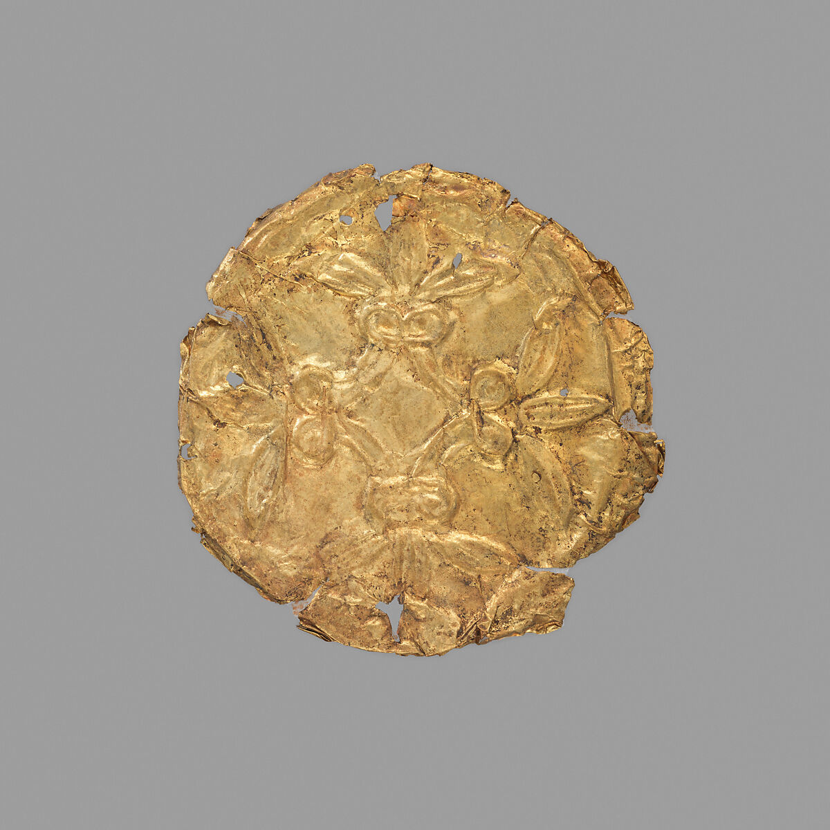 Made of hammered sheet metal, these gold roundels would have adorned a cloth or garment, probably a funerary shroud. Similar examples have been found in the Royal Shaft Graves at Mycenae and in Mycenaean tombs on the island of Rhodes.