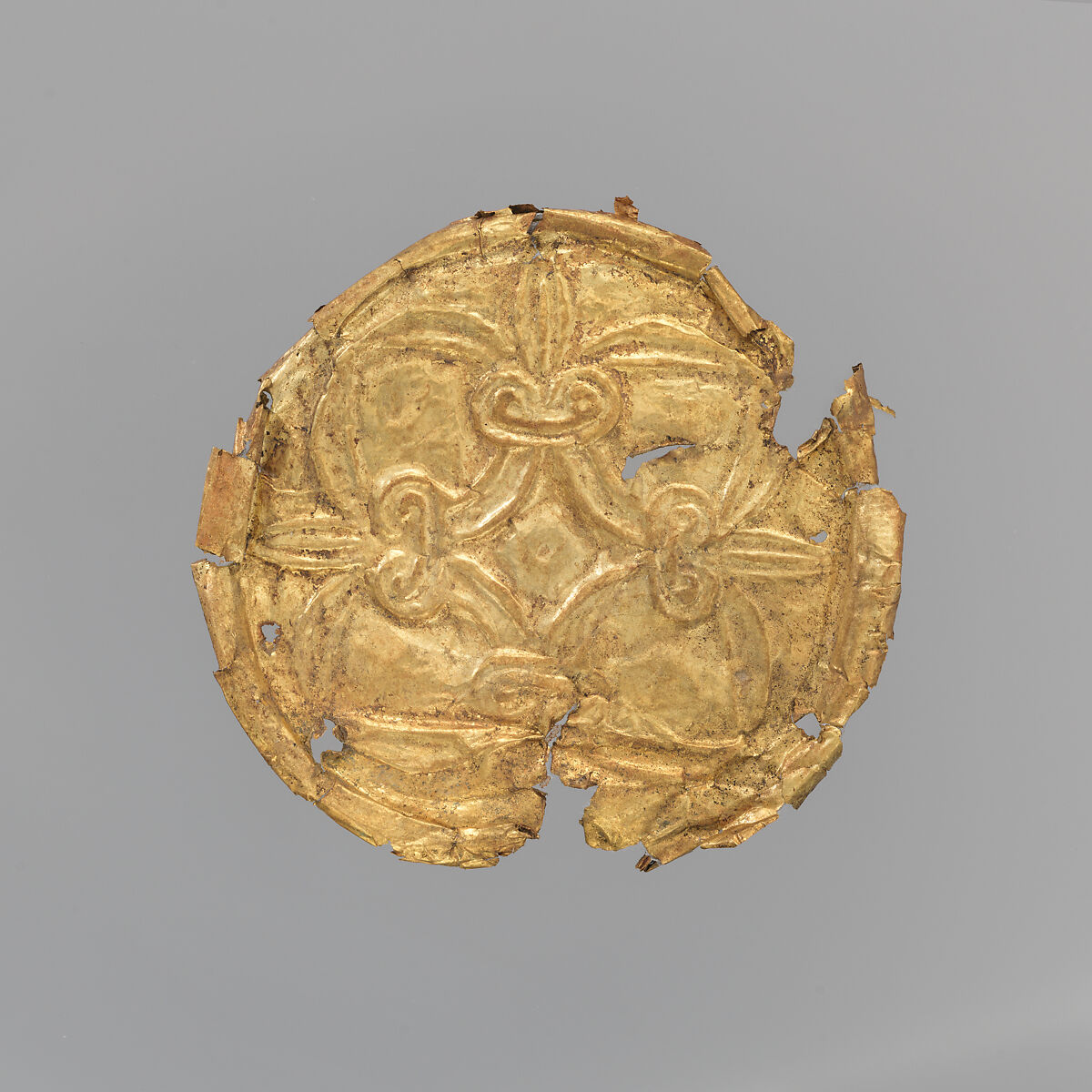 Made of hammered sheet metal, these gold roundels would have adorned a cloth or garment, probably a funerary shroud. Similar examples have been found in the Royal Shaft Graves at Mycenae and in Mycenaean tombs on the island of Rhodes.