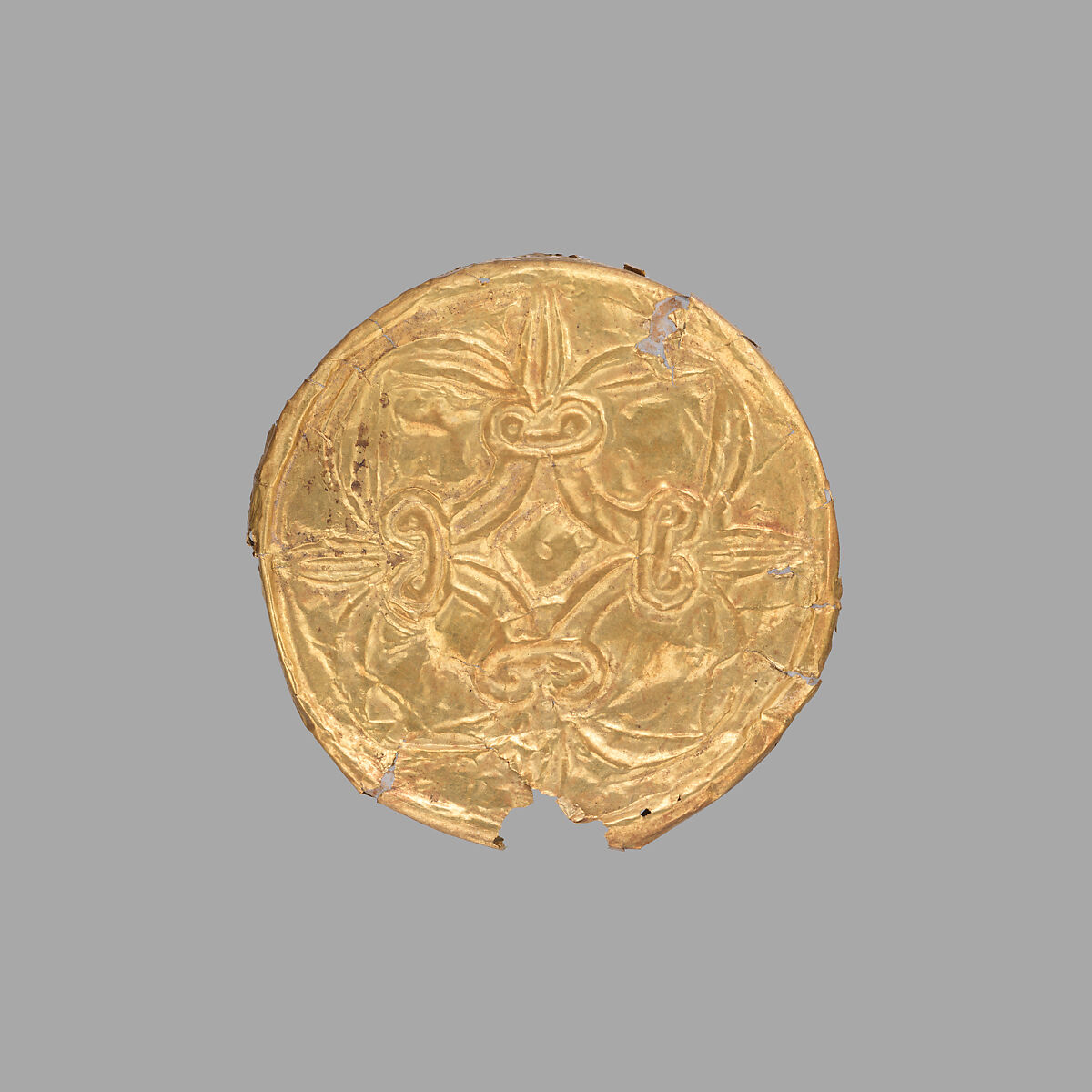Made of hammered sheet metal, these gold roundels would have adorned a cloth or garment, probably a funerary shroud. Similar examples have been found in the Royal Shaft Graves at Mycenae and in Mycenaean tombs on the island of Rhodes.