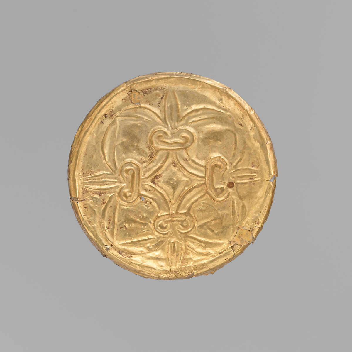 Made of hammered sheet metal, these gold roundels would have adorned a cloth or garment, probably a funerary shroud. Similar examples have been found in the Royal Shaft Graves at Mycenae and in Mycenaean tombs on the island of Rhodes.