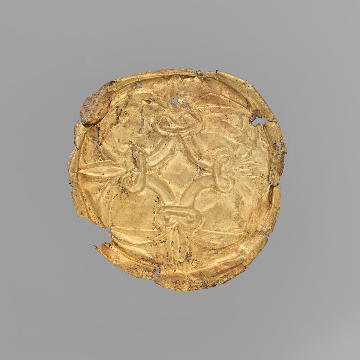 Made of hammered sheet metal, these gold roundels would have adorned a cloth or garment, probably a funerary shroud. Similar examples have been found in the Royal Shaft Graves at Mycenae and in Mycenaean tombs on the island of Rhodes.