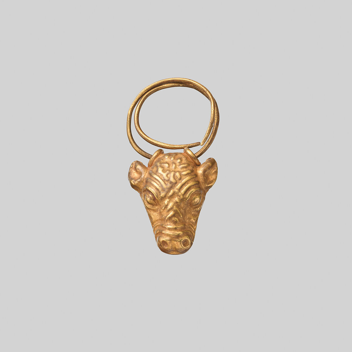 Most of the raw materials for Cypriot jewelry came from the East. Gold became plentiful in the Late Bronze Age, when Syria and Egypt were the primary sources. This earring is a Cypriot creation, an ornament in the form of a bull's head.