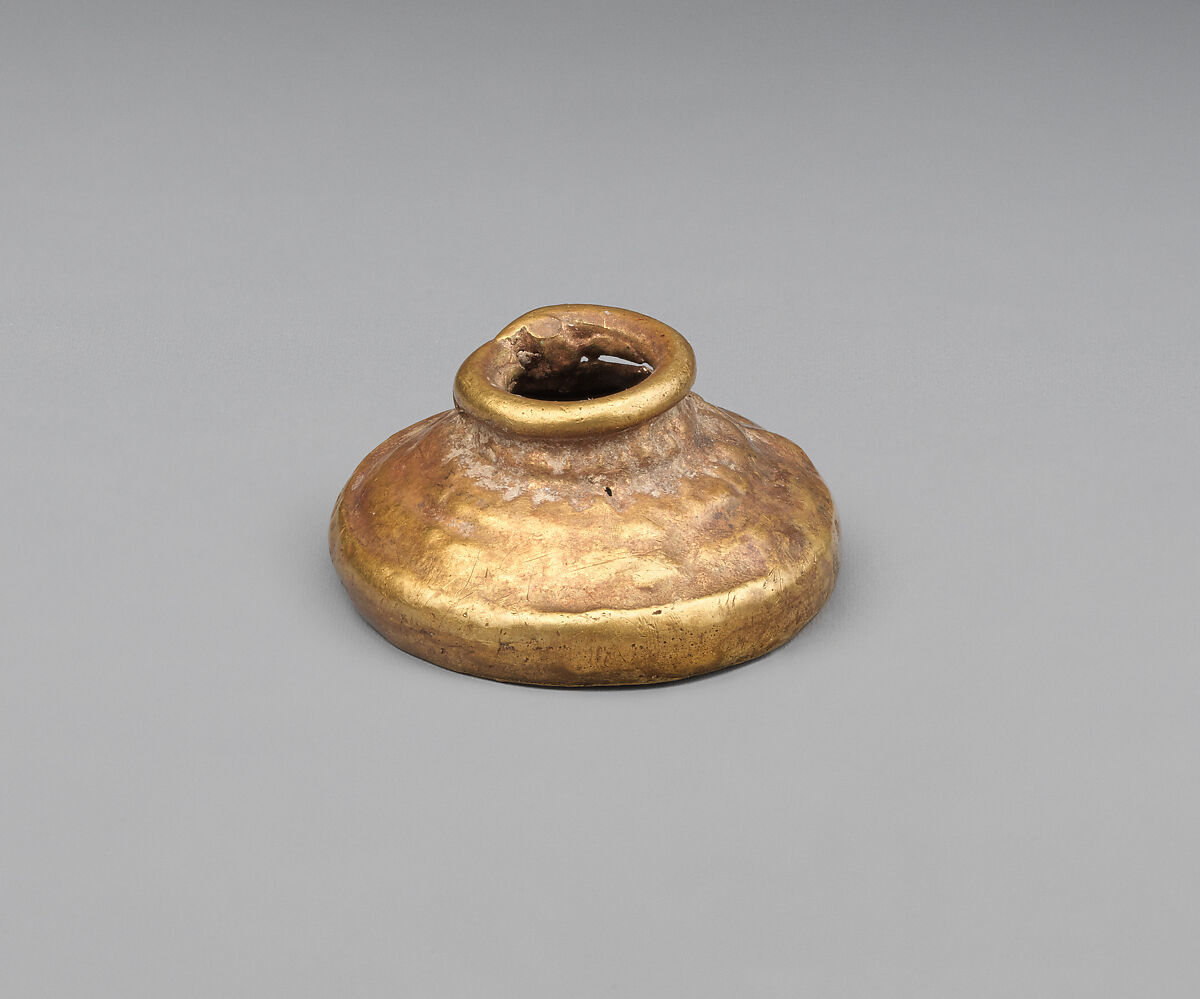 The gold mount would have held a cylinder seal, an object used to make marks in clay or wax, first invented in Mesopotamia in the fourth millennium B.C. Imported cylinder seals begin to appear on Cyprus in the Middle Bronze Age (ca. 1900–1600 B.C.), but the Cypriots did not start making their own cylinder seals until the Late Bronze Age.