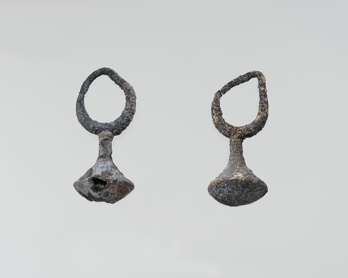 This distinctive type of earring was probably introduced to Cyprus from the Near East. Though less popular than other Phoenician objects in the West, it has been found on Malta and at Carthage, for instance.