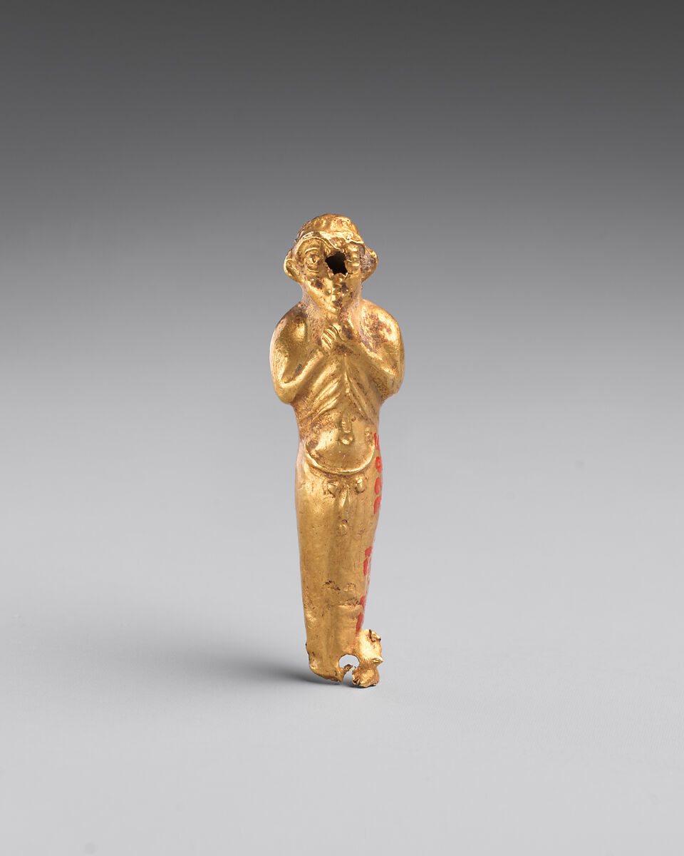 The figures' arms are shown clasped over their apparently nude chests; the rib cage is emphasized front and back. The lower body is covered with a long, close-fitting garment that reveals their genitals. The meaning of the figures is unclear, but the objects have attachments loops on the back. Their size and appearance suggests a connection to the amulet cases (74.51.3315, .3321).