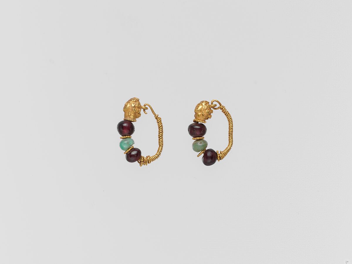 - Title: Gold earring with woman's head and beryl and garnet beads