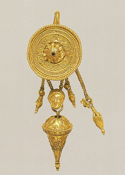 • Title: Gold disk earring with a female head and cone pendants