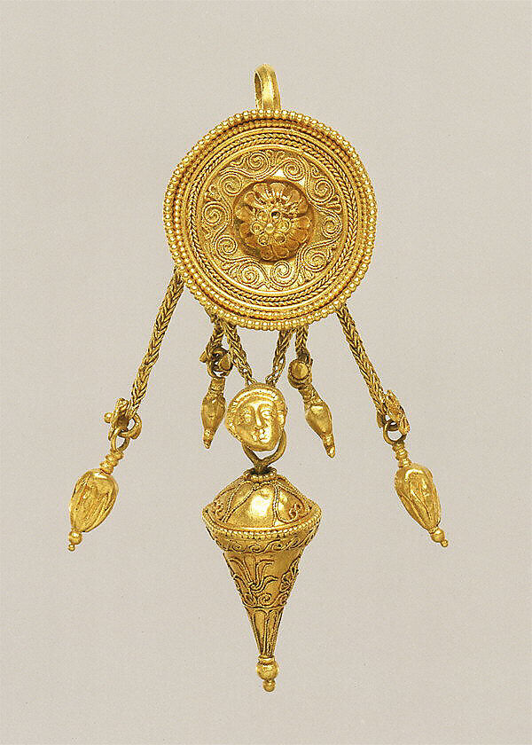 • Title: Gold disk earring with a female head and cone pendants