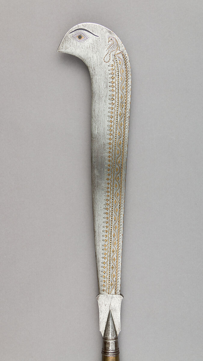 The worship of Kālī, like that of the other Indian goddesses who are revered for their generative powers, regularly includes blood sacrifice, which was once carried out with weapons such as this example. It is a smaller version of the rāmdāo, a top-heavy sword used to decapitate sacrificial buffalo in commemoration of the slaying of the buffalo demon, Mahisha, by Kālī's progenitor, Durgā. This lighter sword of the type called either kartrī or churī, was intended for smaller animals such as goats (see also acc. nos. 36.25.1286). The eye engraved on the blade signifies the presence of the goddess as she watches over the sacrifice. The hump-like projection above the eye on the back edge of the rāmdāo represents the tasseled hat of the defeated buffalo demon. The hat is sometimes also seen in paintings of Durgā, floating above her head as she battles demon armies, as a symbol of her victory over Mahisha. Animals sacrificed during worship are thought to have been liberated instantly from the painful cycle of rebirth to which Hindus believe all living creatures are bound. The sacrifices are intended to nourish the goddess and to secure from her the blessings of life.