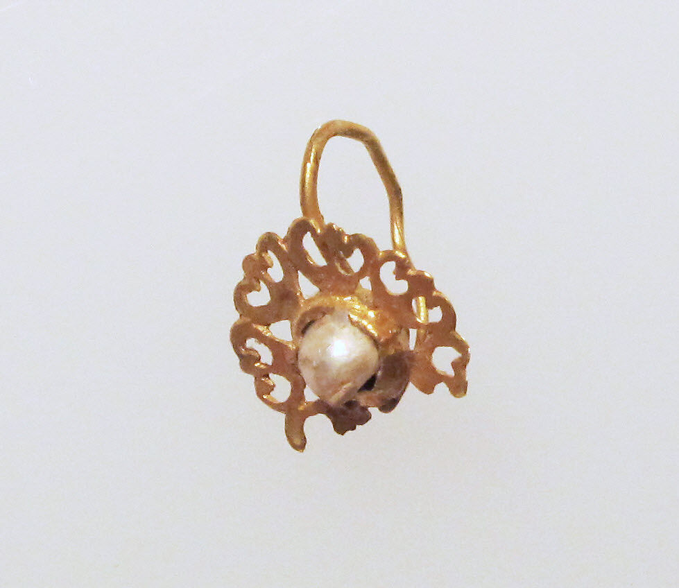 - Title: Gold earring with pelta disc and pearl setting