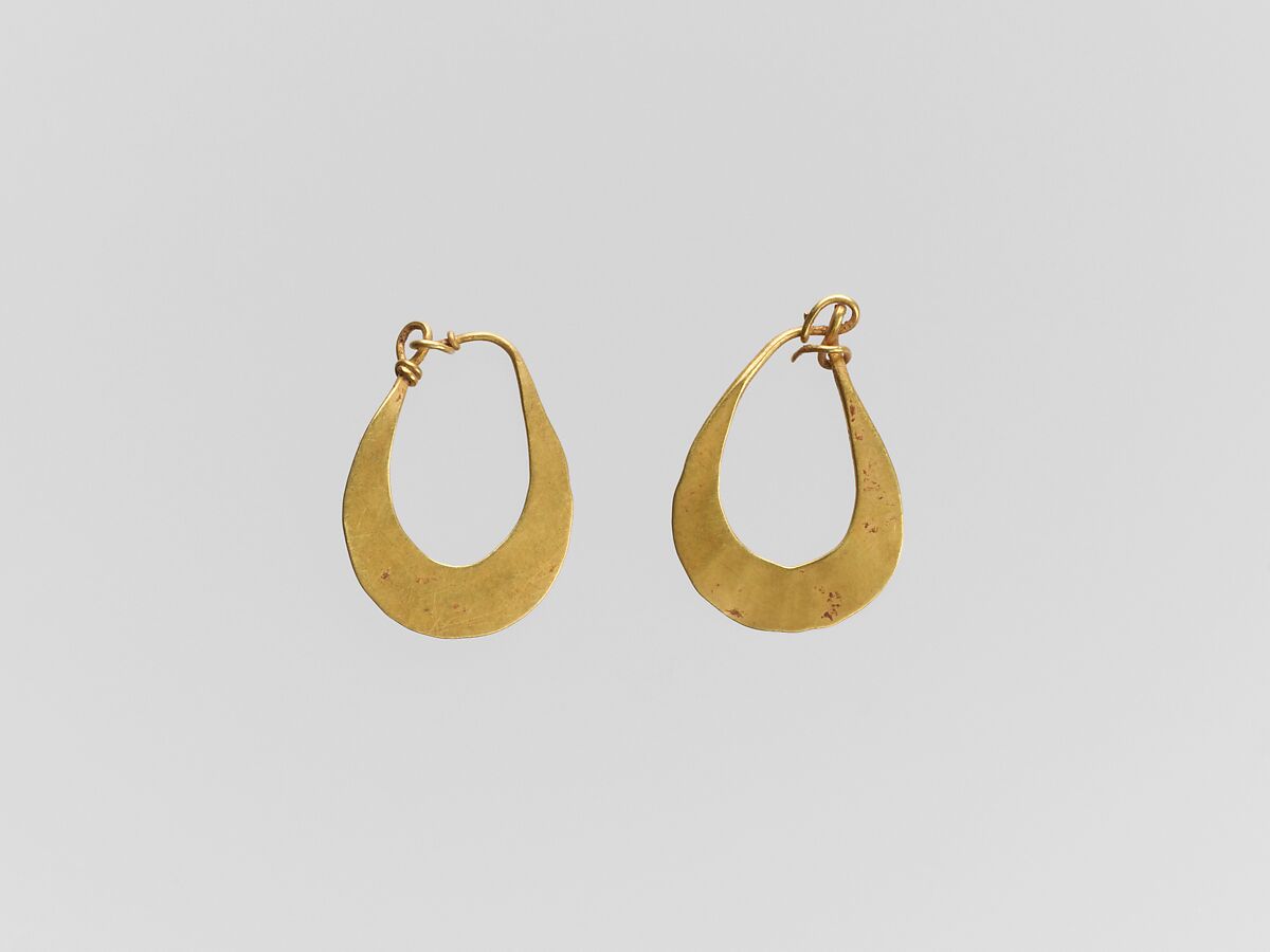 Cresent earrings are developed from the symmetrical hoop-type by expanding the body into a flat cresent-shaped plate.