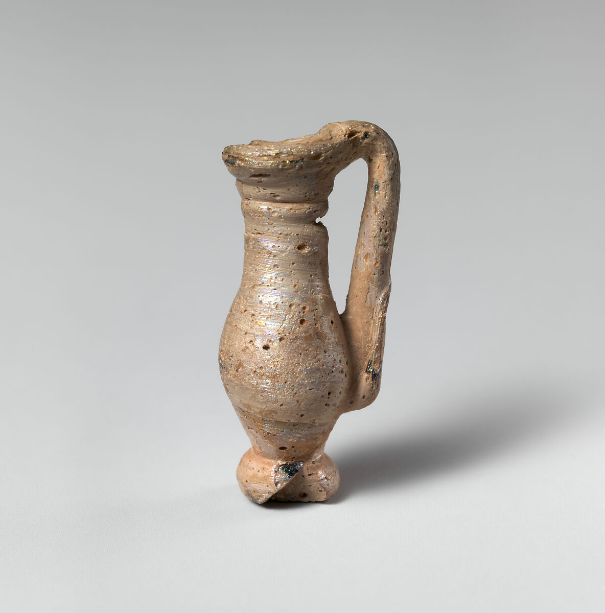 Complete, except for weathered chip in base; dulling, pitting, and most of surfaces covered with iridescent creamy weathering. During manufacture a horizontal gap was left on the neck in the trail that formed the vessel.