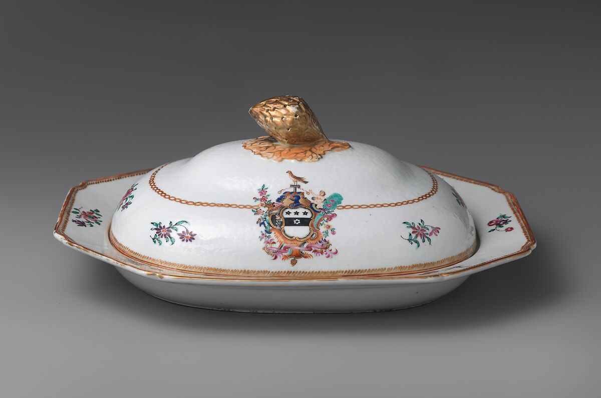 This object belongs to a large dinner service (10.149.1–.248) bearing the Townley family coat-of-arms. The service, probably ordered by Justice Samuel Chase (1741–1811) of Annapolis, Maryland, displays the enamel-painted arms of Margaret Townley, Chase's aunt.