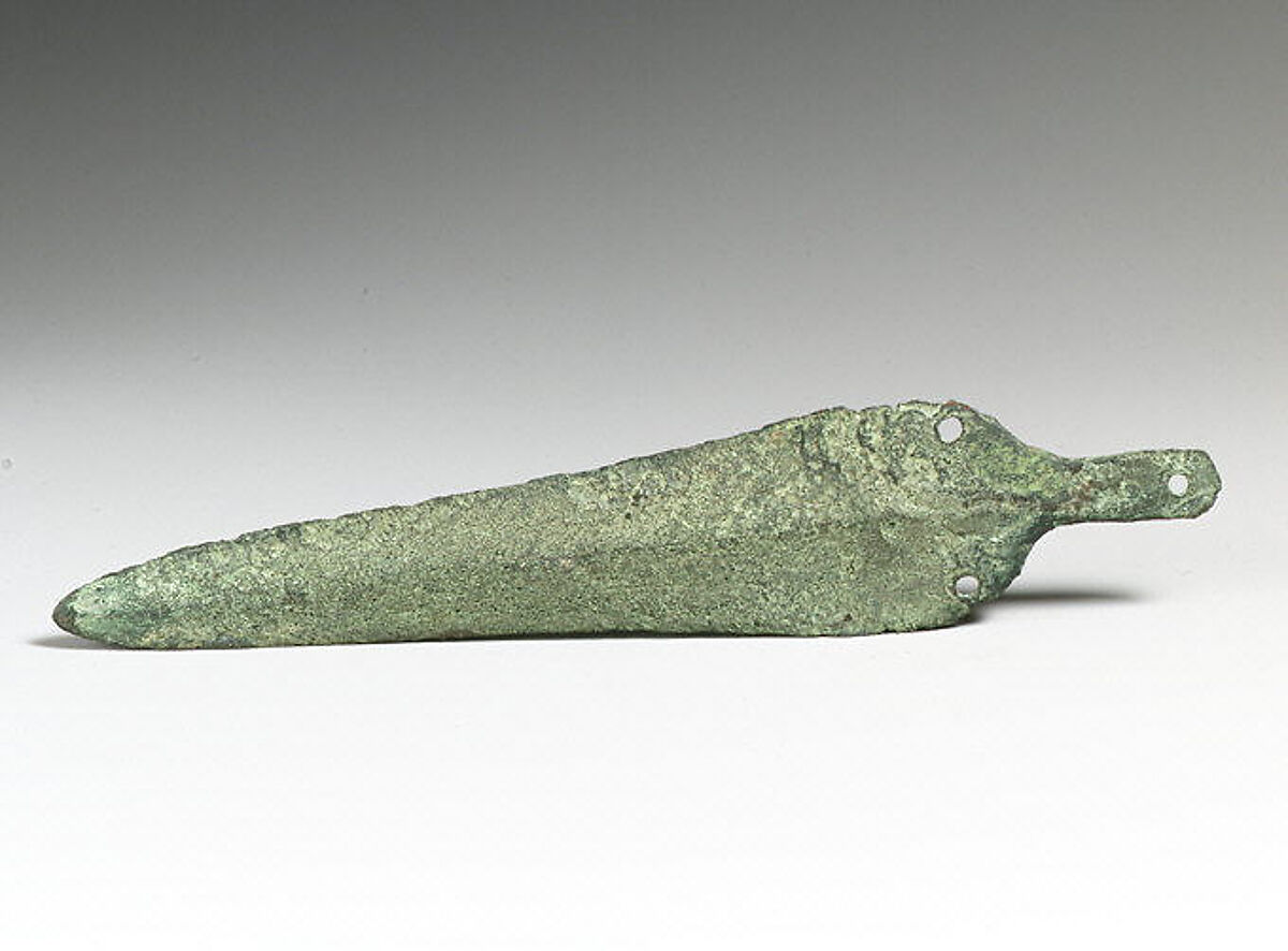 Leaf-shaped blade with tang; three rivet-holes, two in base of blade.