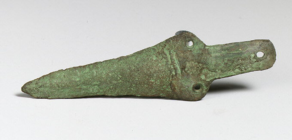 Leaf-shaped blade with tang and three rivet-holes, two in the base of the blade.