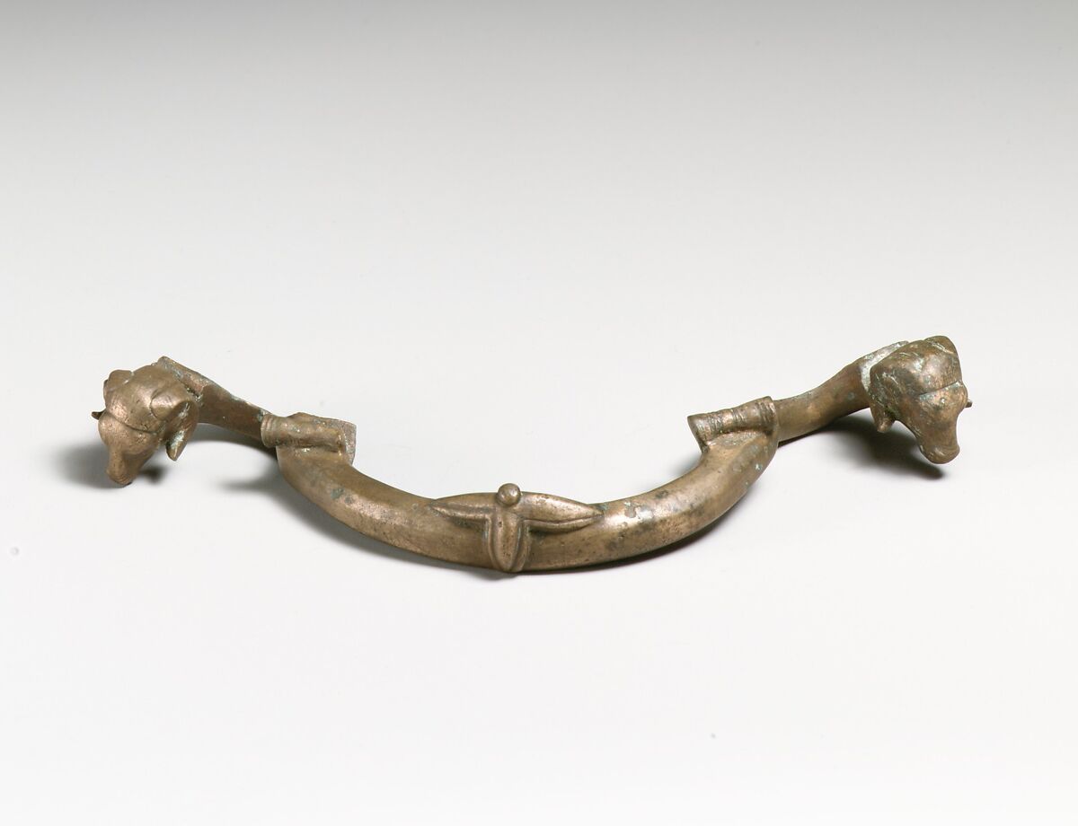 Pair with 74.51.5453. Horizontal handle curving upward terminating in rams' heads; in the center a three-leaved ornament.