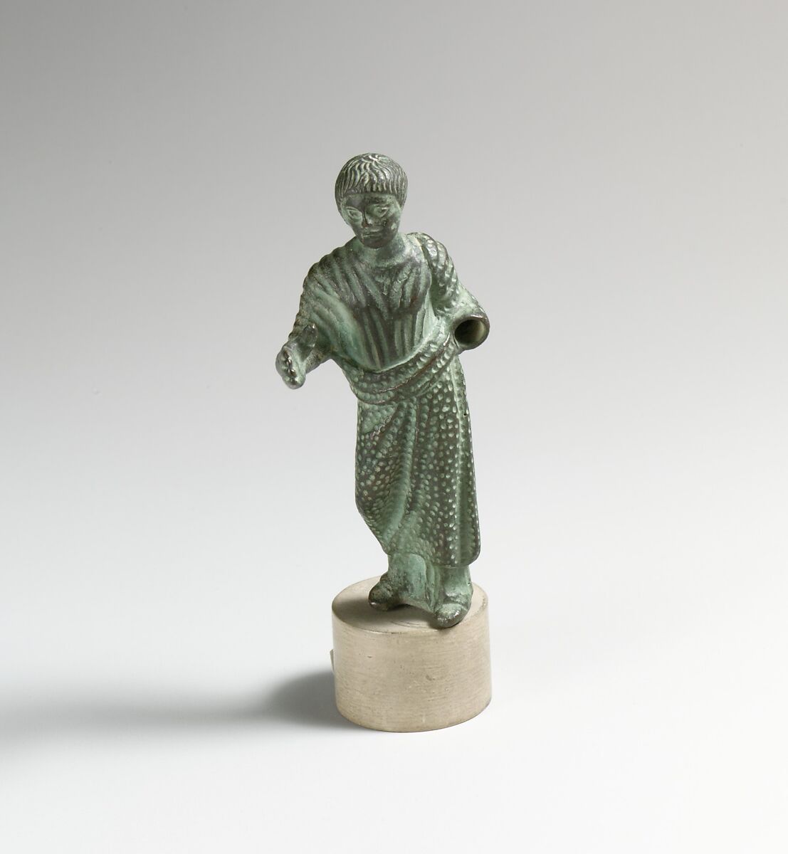Weight on left leg; right arm extended with hand open; left lowered and bent at elbow; wearing a tunic and mantle.