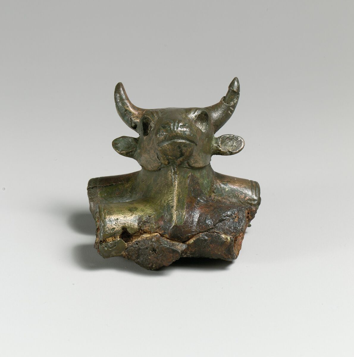 Bull's head attachment from a tripod with horizontal tubular socket. Painstaking scholarship over twenty years has discovered that these pieces and others now in Berlin originally belonged to one bronze and iron rod tripod. Luigi Palma di Cesnola and his brother Alessandro divided their finds made in Kourion in 1873–74 and sold them to New York and Berlin, respectively. Bronze tripods represent one of the most prestigious and costly creations of the Archaic period. While they originated in the Near East, by the eighth century B.C. they were exported westward to the Greeks and Etruscans as well as copied locally. Thanks to its copper mines, Cyprus was probably an important production center; numerous examples have come to light on the island.