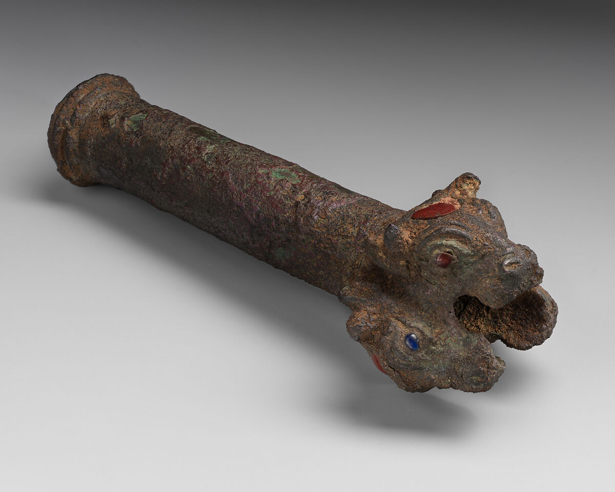 The scepter head is topped by three mold-made bull's heads. Bull's heads are common in the art of Late Bronze Age Cyprus. The eyes are inlaid with glass that is not original. On the forehead of each bull is a crescent-shaped inlay; two are carnelian and one is green glass paste. Another tubular piece of the scepter, now missing, was originally above the three bull's heads.