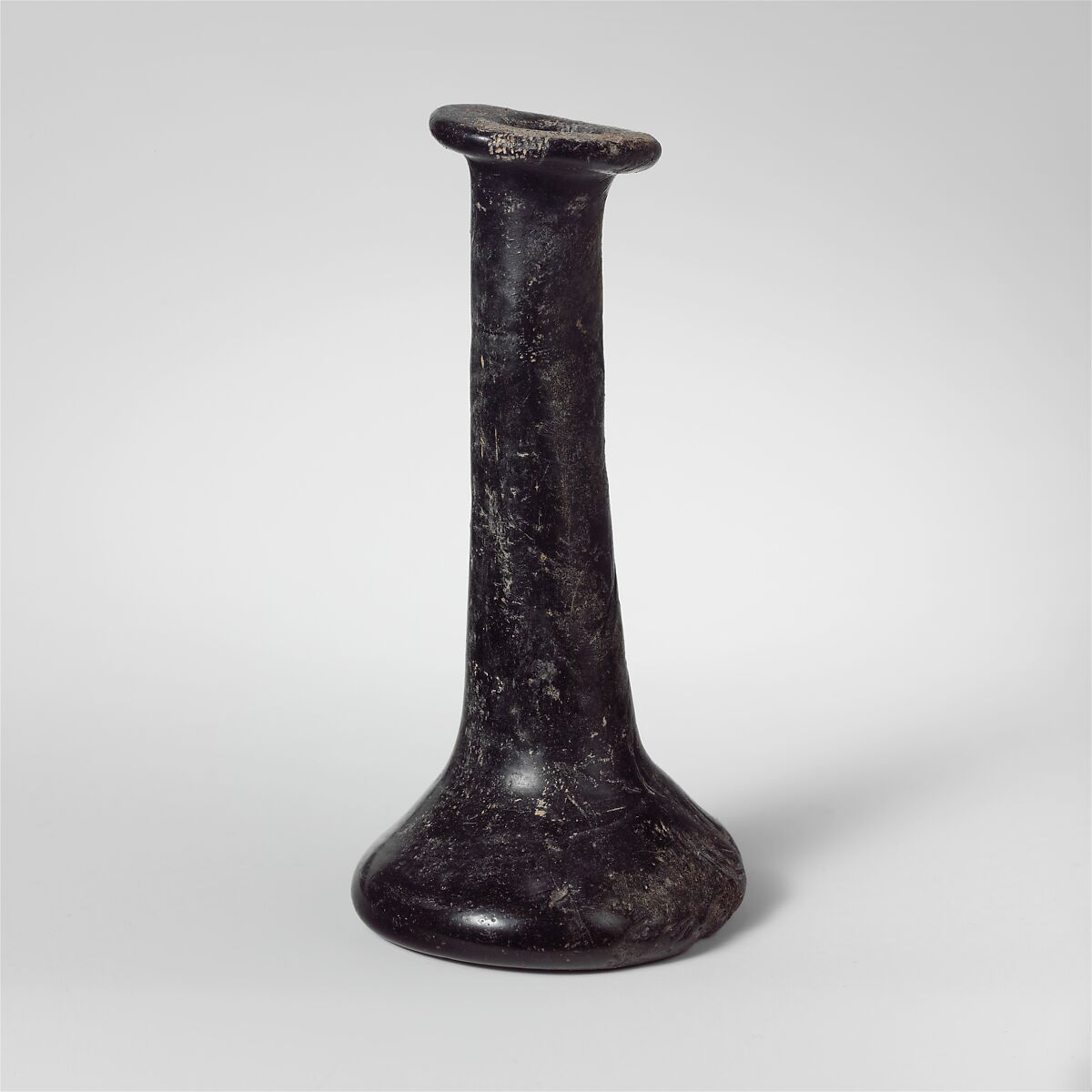 Broad, slanting rim, folded out, over, and in, flattened on top, forming irregular oval mouth; uneven, tall, cylindrical neck; lo, concial body; flattened bottom with central deep kicck and pontil scar.
