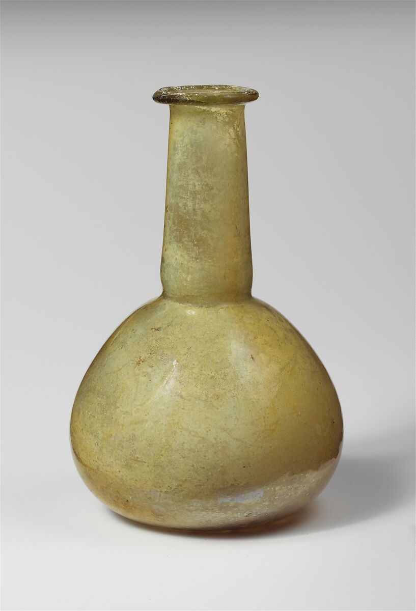 Uneven rim folded out, over, and in; flaring mouth; cylindrical neck, expanding slightly downwards, with tooled indent around base; bulbous body; flat bottom.