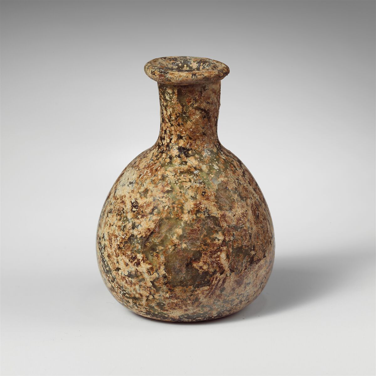 Thick everted, horizontal rim, with rounded outer lip and circular groove on top surface; short, cylindrical neck, tapering downwards; ovoid body; flat bottom with slightly concave center.