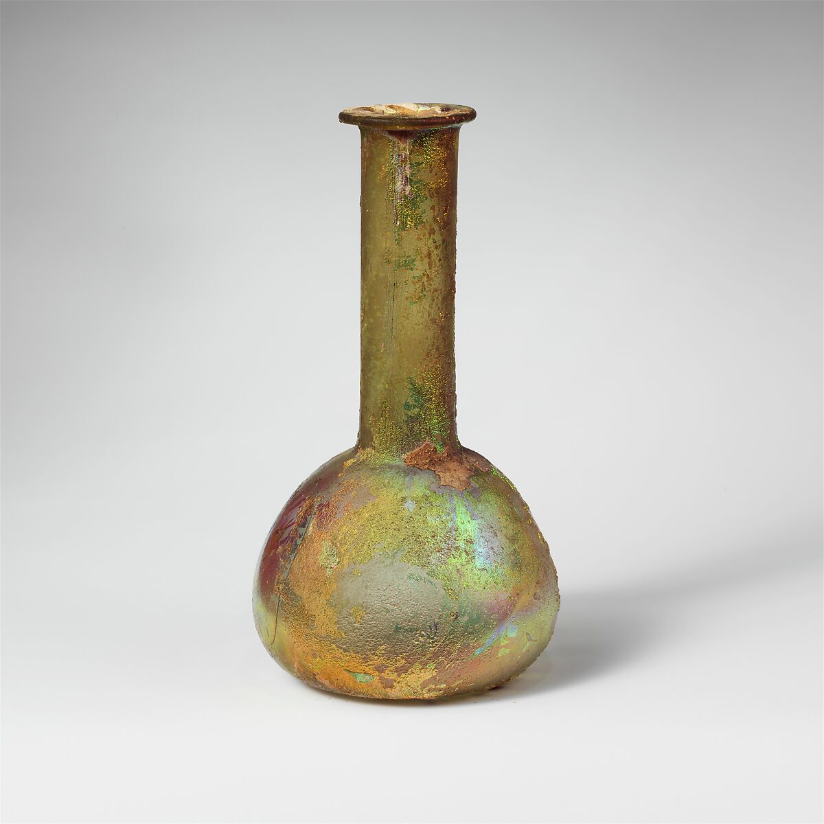 Rim folded out, over, and in, flattened on top and into sides of mouth; cylindrical neck, tapering downwards; bulbous body, expanding downwards; flat bottom.