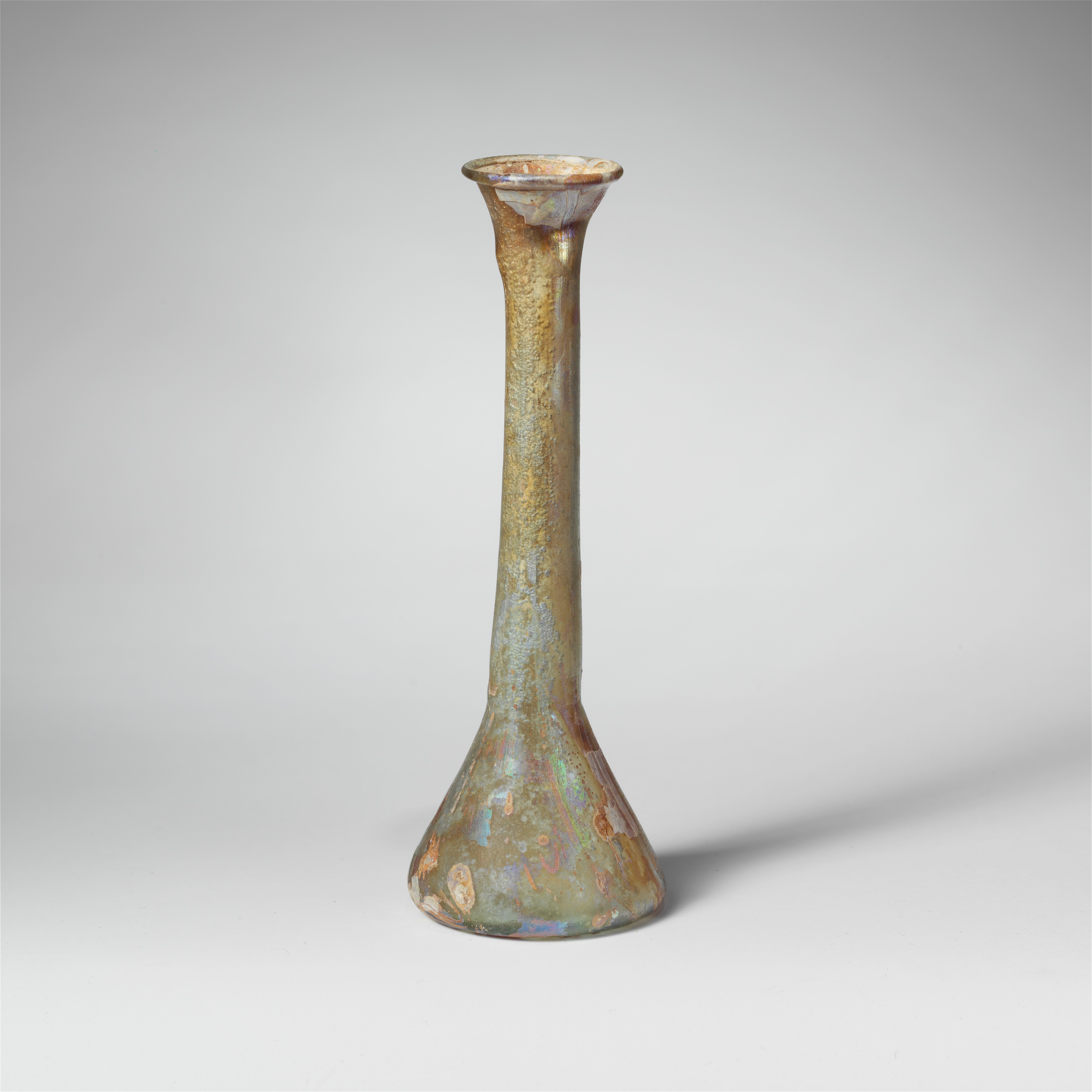 Rim folded out, over and in; flaring mouth; slender, and slightly concave cylindrical neck, with irregular bulges from tooling around top and horizontal indents around base; conical body; pushed-in bottom, with traces of circular pontil mark.