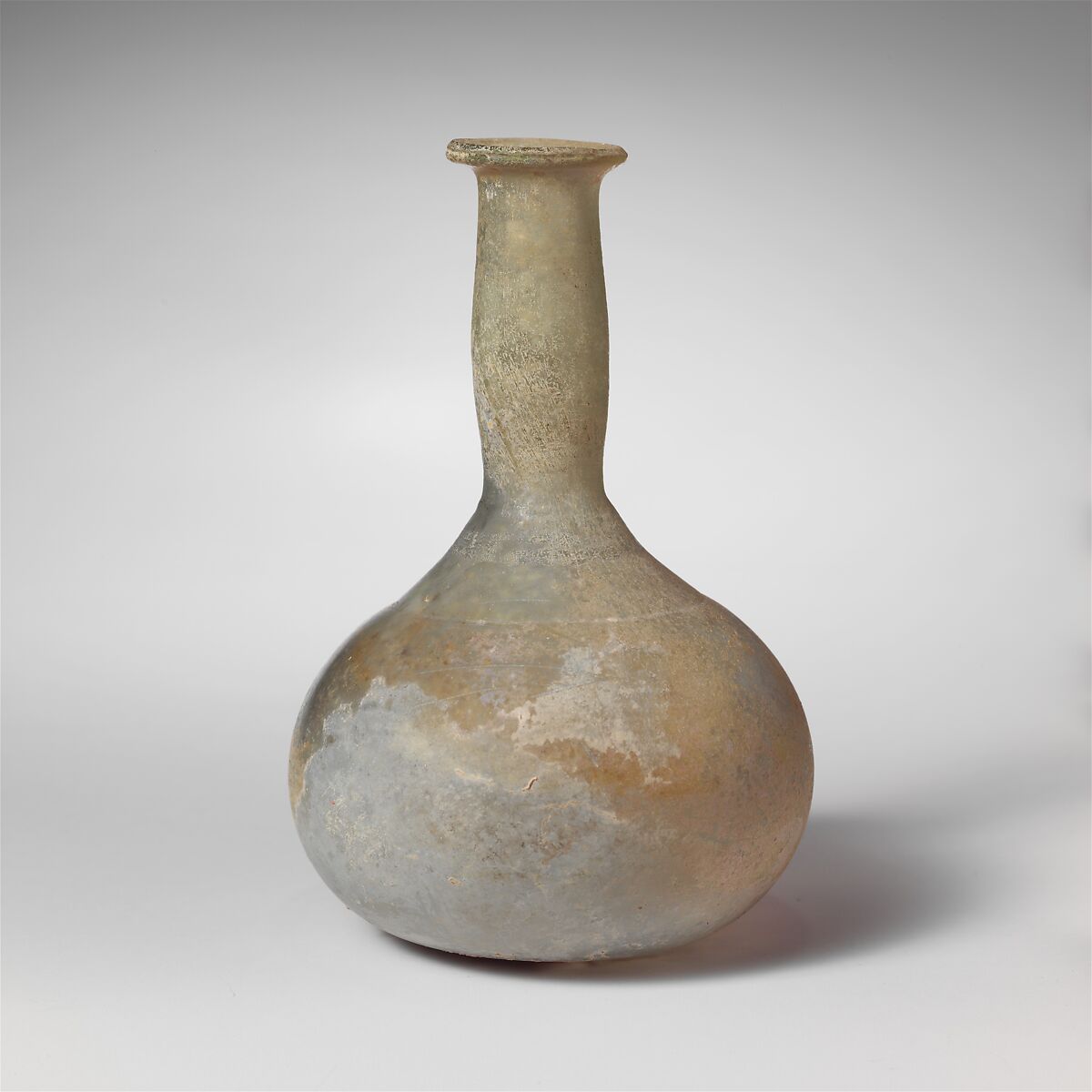 Rounded rim folded out and tooled around outer lip; flaring mouth; slightly convex cylindrical neck, tooled in around base; squat globular body; thick, flat bottom.