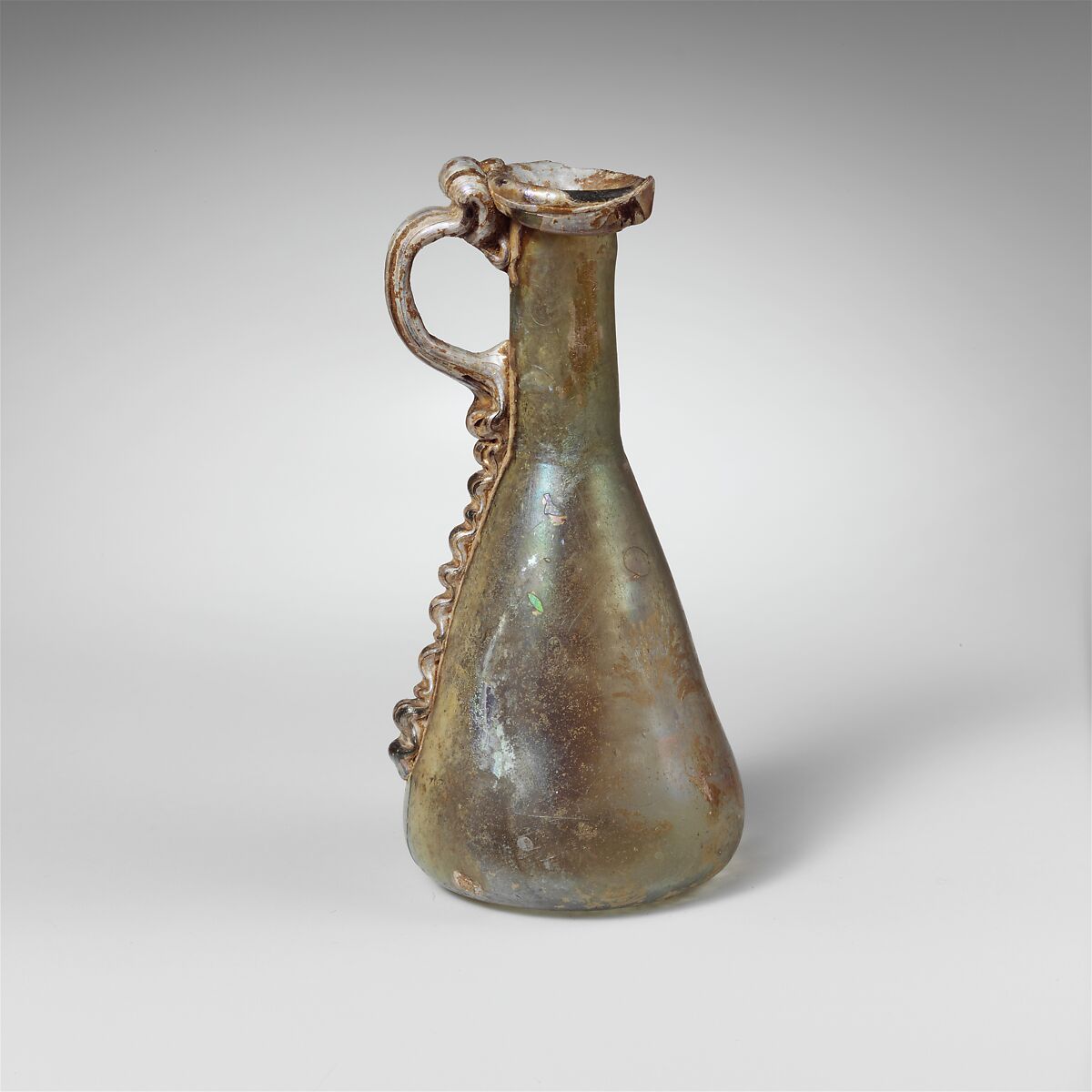 Collared rim, folded out, down, and up, with lip on outer edge of flaring mouth; cylindrical neck with tooled indent around base; straight sides to conical body; flat bottom; handle applied as a long trail down side and lower part of neck, then drawn out in a loop and trailed on to rim and top of neck.
