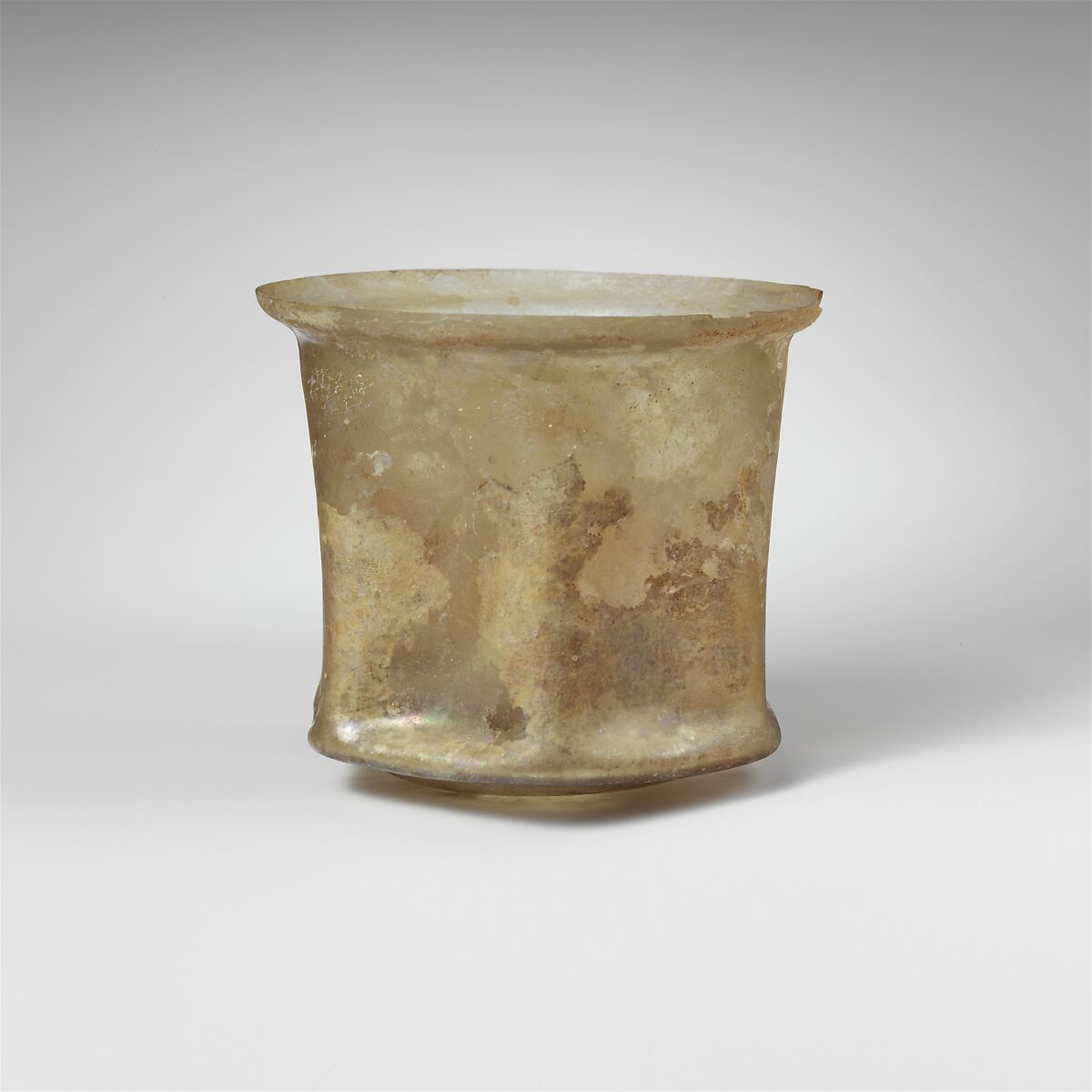 Complete except for one large chip in rim and cracks in side below; pinprick and larger bubbles; dulling and faint iridescent weathering on exterior; patches of soil encrustation and weathering on interior.