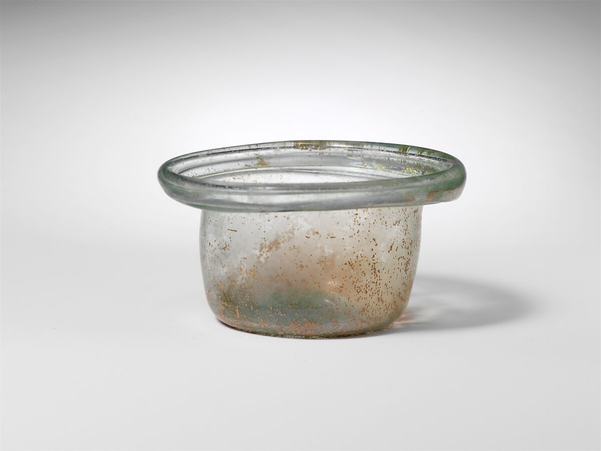 Tubular collared rim, folded our, round, and down; horizontal, uneven neck; slightly convex sides, tapering gently downwards; pushed-in bottom with prominent pontil scar at center.