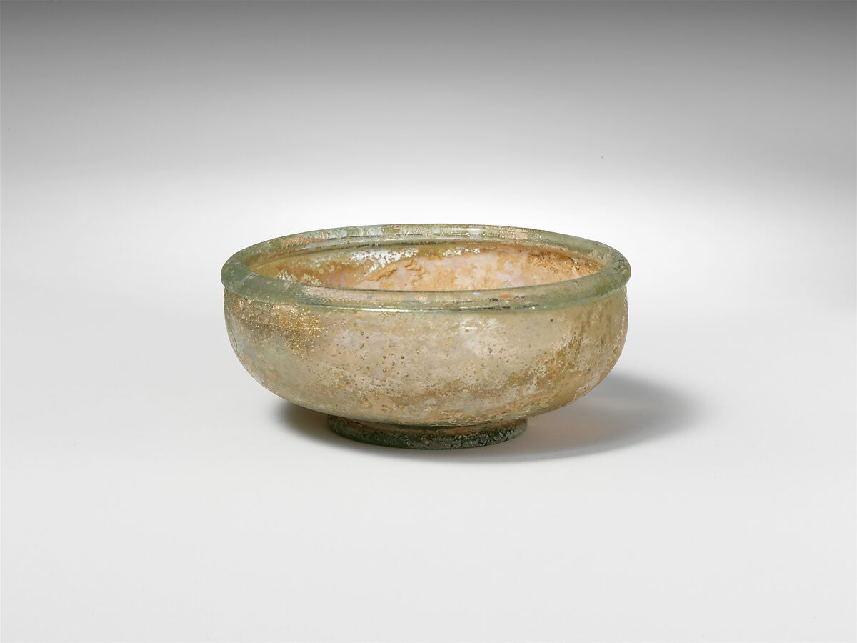 Thick, rounded rim, with inner lip; short, convex, curving sides to body; solid pad base; flat bottom, with small kick at center and pontil mark.