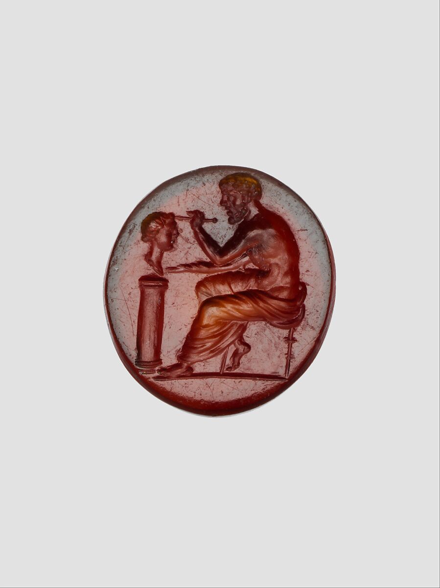 This is a rare depiction of an artist at work. In his right hand, he holds a stick-like object that has a round knob at one end and is pointed at the other and slightly thickened, likely a brush. In his left hand, he holds another object, which is evidently not a mallet but perhaps a palette seen in perspective. Ancient marble sculpture was often brightly painted. The artist holds his tool lightly and is probably painting rather than modeling.