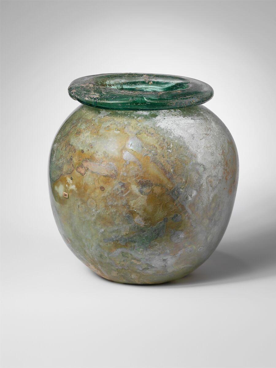 Intact, but some small internal cracks; many bubbles, some black streaky impurities in rim; faint iridescent weathering on exterior, limy encrustation and thick, creamy brown weathering on interior. Sealed inside the tubular rim is visible a quantity of liquid, probably water, that seeped in when the jar was buried.